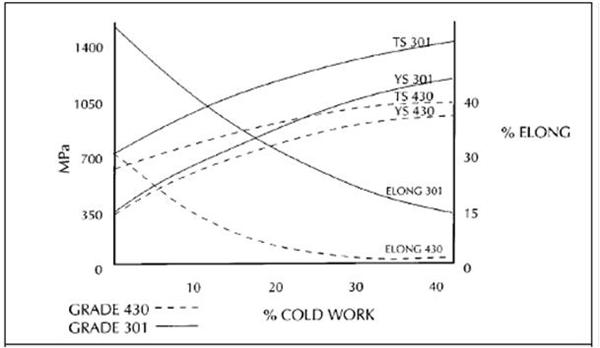鋼的成形性能極大地取決于材料在冷加工時其屈服強度達到極限抗拉強度時的速率。屈服強度和極限抗拉強度曲線帶之間的縮小說明成形是被限制的(見圖1)。曲線帶之間的縮小顯示,大部分屈服強度可以一直使用,任何進一步變形會導致破裂。另外一方面, 鋼加工性的增加顯示曲線帶卻沒有收斂(如301鋼種),在相同冷加工變形量的情況下,這種材料它有極高的塑性,在成形過程中允許有嚴重的變形。
